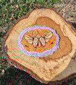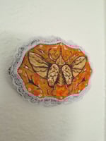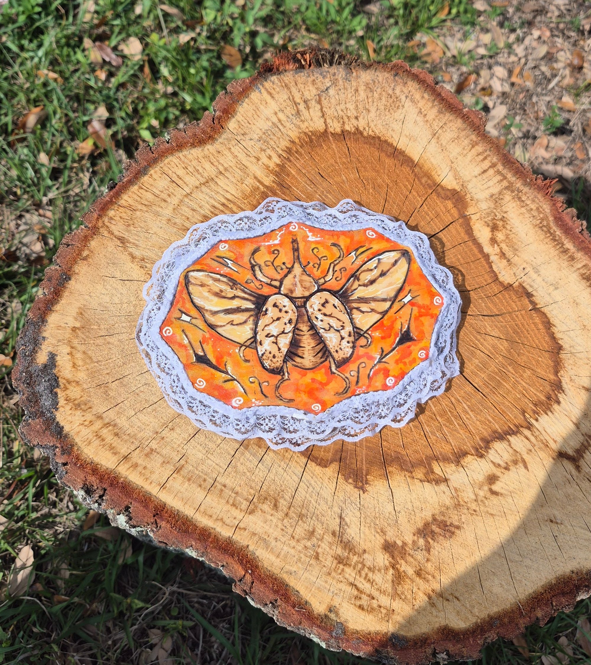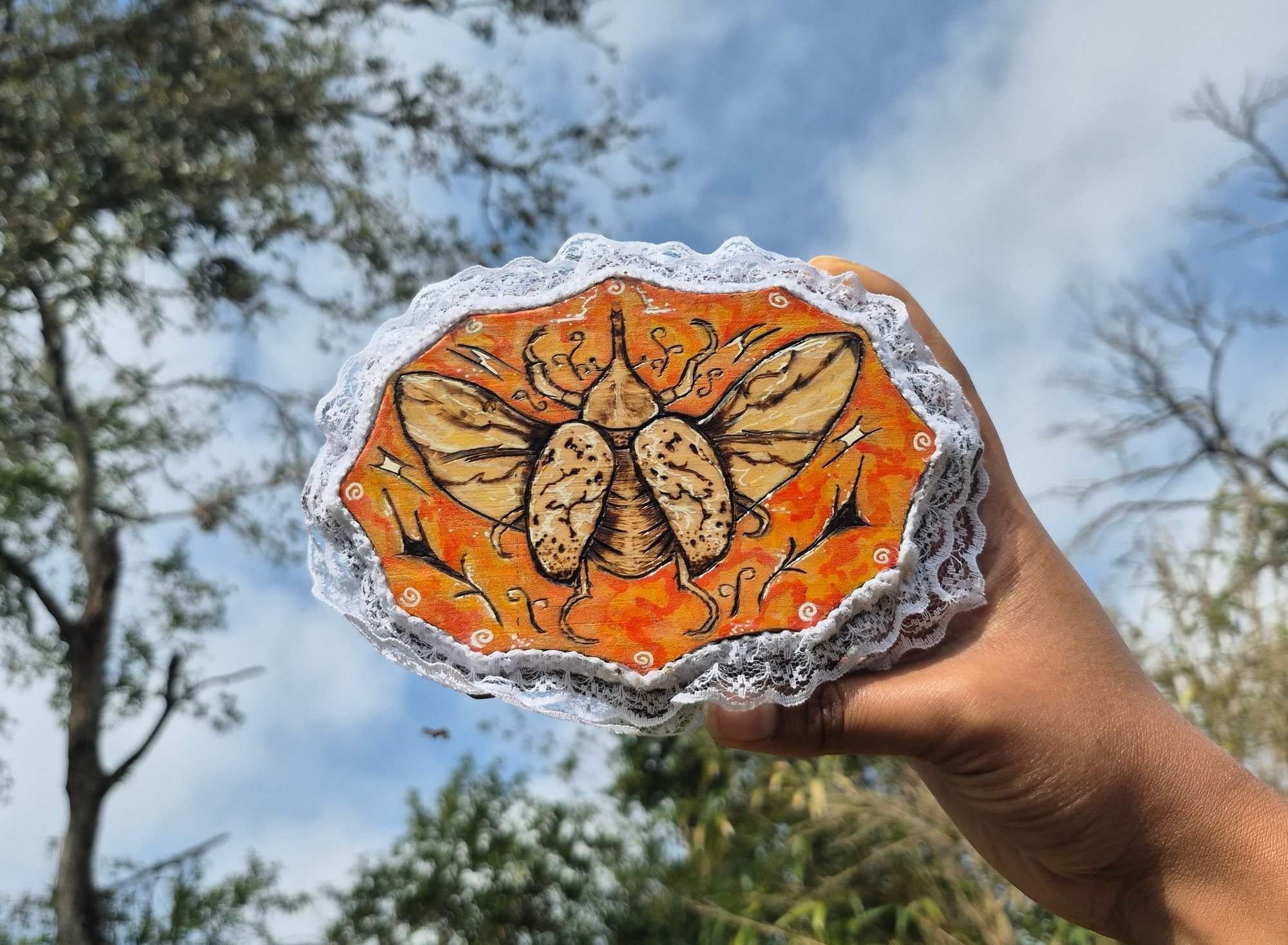 6x4 inch wood burned piece with lace trim. Gouache and acrylic paint.