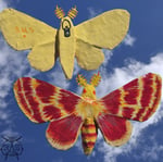 Handmade and painted paper mache moth with hanging clip on back and comes with a pair of command strips. This moth was painted with acrylic and gouache, finished with a high gloss varnish. Does not hang off tne wall flush, giving it the illisuon of slightly hovering off the wall Measuring 8 1/2in length and approx 5 1/2in height. DISCLAIMER if using command strips DO NOT take off the strip attached to the moth, it will tear the paint off and ruin the piece. You will only have to replace the strip attached to the wall